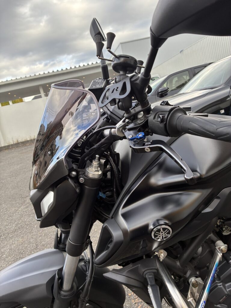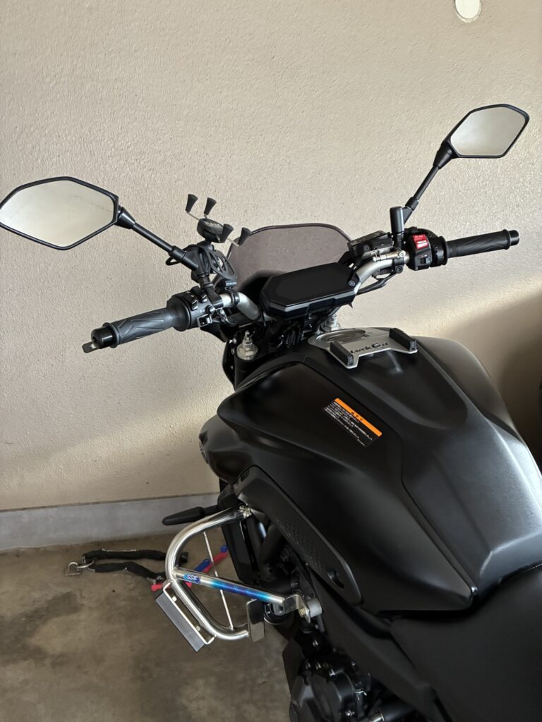 MT-07の純正ハンドルポジションはやや低めで、フルロック時やスタンディング姿勢では少し窮屈に感じることがあります。
