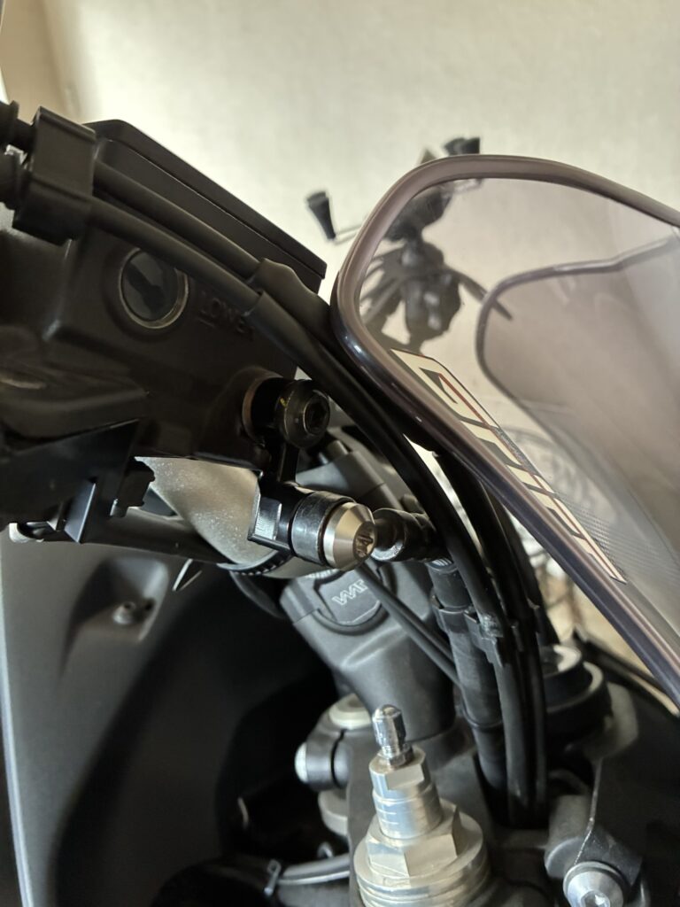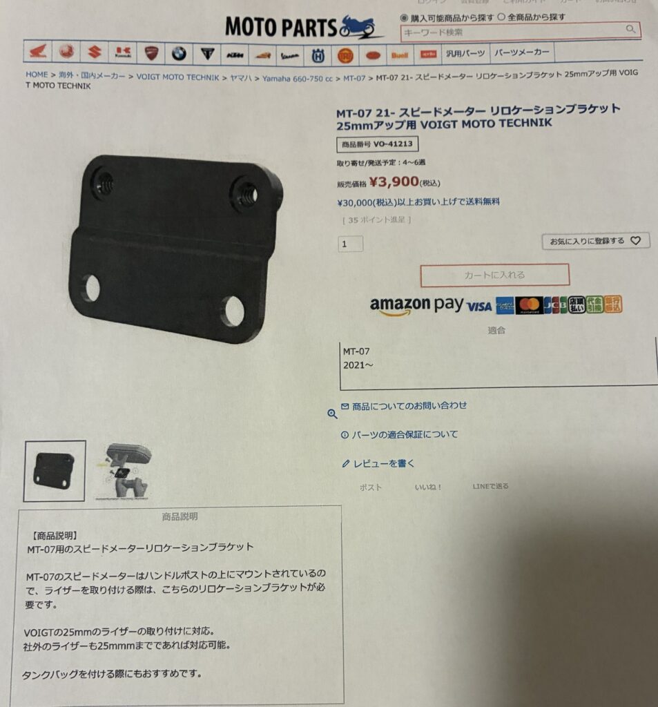 私のMT-07(2021〜2022年式)はハンドルアップすると、純正メーターのブラケットが干渉してしまい流用不可に。ここが大きな悩みどころでした。