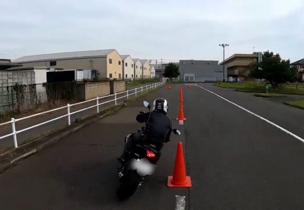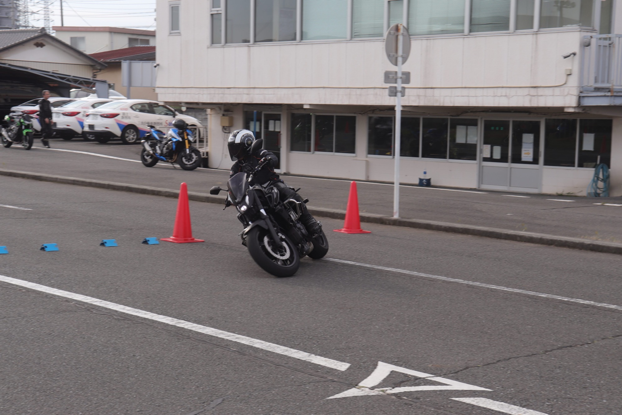 指導員からは、リアブレーキのかけすぎでロックしやすい傾向があると指摘を受け、しばらくはフロントブレーキ主体(感覚的にフロント9:リア1)で練習。